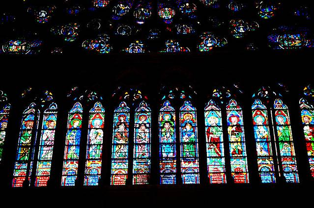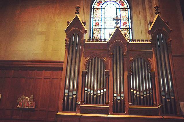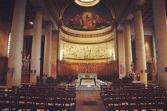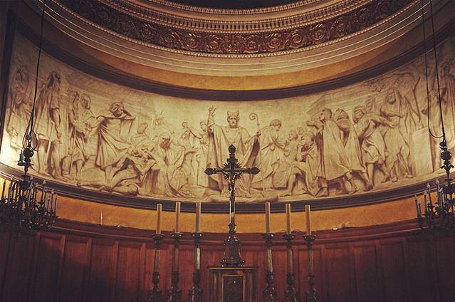 四面环绕着巨幅的彩绘玻璃,怀抱圣子的圣母雕像庄严而慈祥,浓墨重彩的油画值得细细看过,银色的管风琴在阳光的照射下发出圣洁光芒。