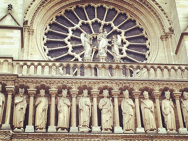 在阳光照射下,散发着金色光芒的圣母院全部用石头砌成,一对钟塔矗立在大门外,三座尖顶像是千层饼的拱门迎接着来自世界各地的游客。千层饼的中间,每一层都装满了大大小小神圣的雕像。