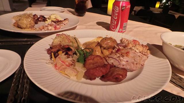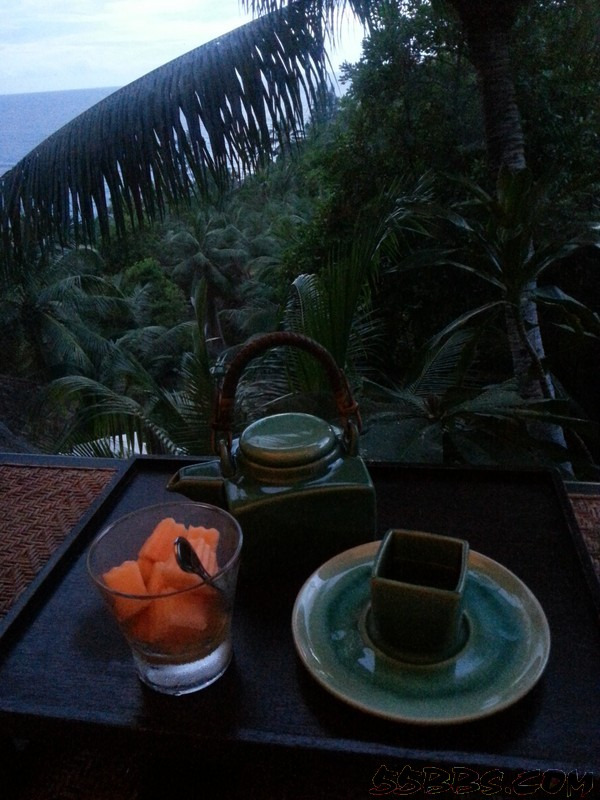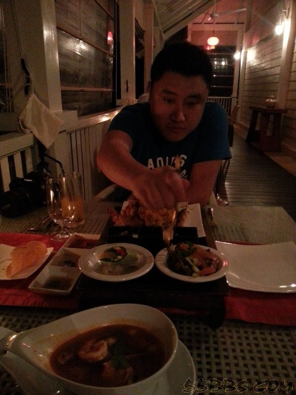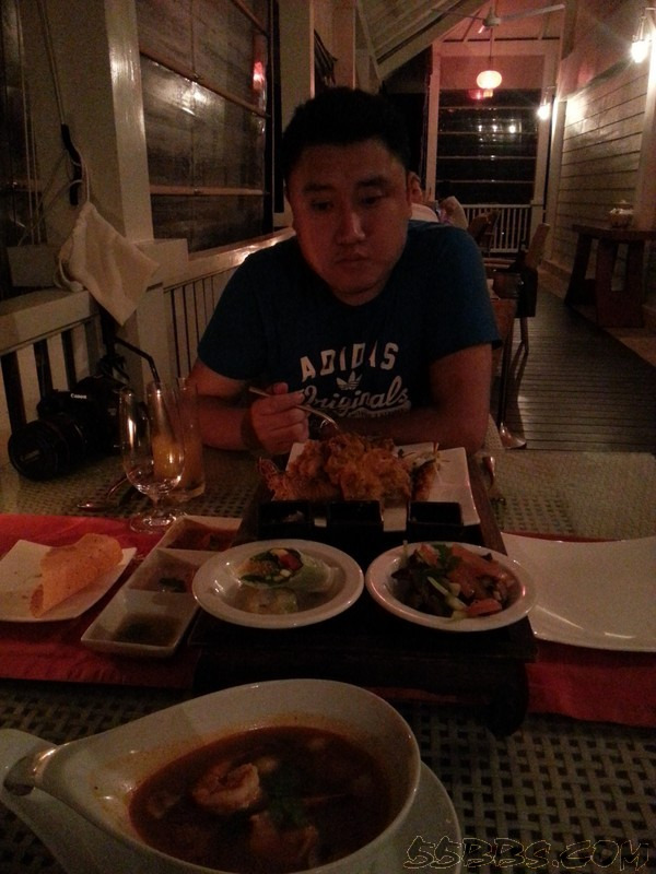 当天晚上,我们享用了Romance Pakeage里面的第3项--每次入住可获酒店餐厅双人3道餐晚宴一次或别墅内用餐一次正好赶上酒店的泰国餐厅开门,于是二话不说的就海挫了一顿,至于味道嘛~~~冬阴功汤很是地道(饮料是不包括在内的,需要额外支付)
