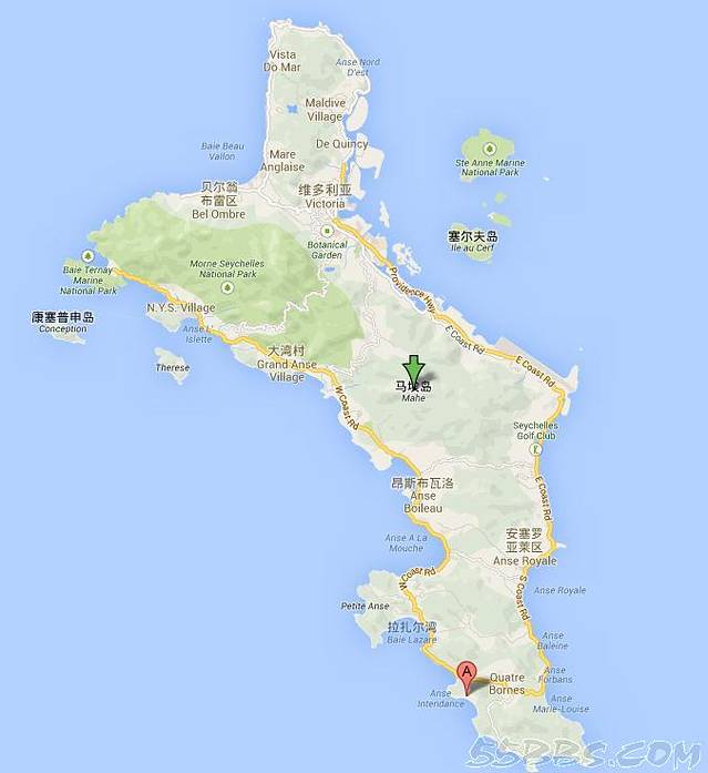图中的A点是悦榕庄的位置,机场差不多是在靠近塞尔夫岛的地方。所以我们的酒店在最南边,而首都维多利亚在北部。