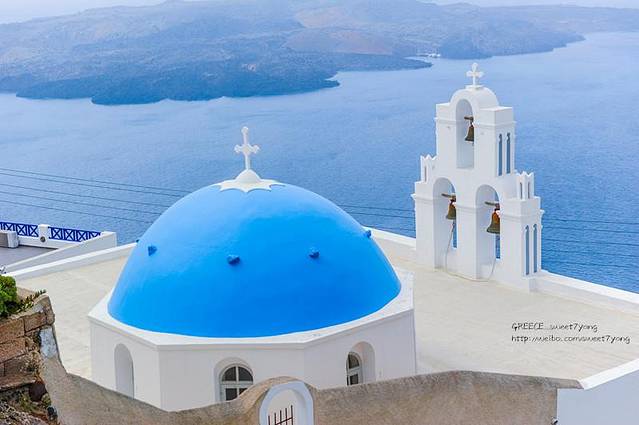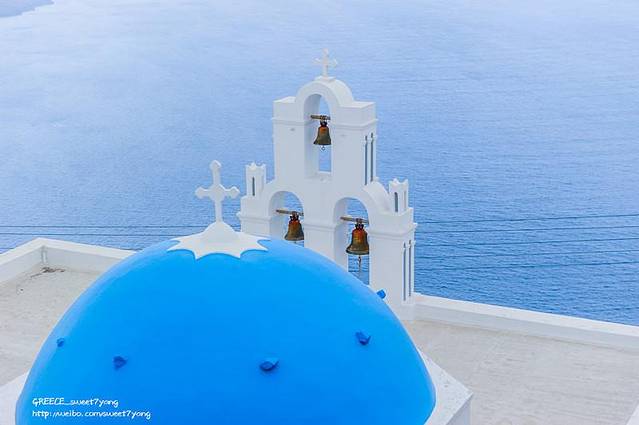 这天中午的轮船,我们出发去米克诺斯岛,早上还有些时间于是又去了一次蓝顶教堂,我和咖啡那天都有些小感慨,因为要离开圣托里尼了,两个人话都不多,只是抓紧时间多看些这里的美景,深怕有遗漏似的,呵呵。
