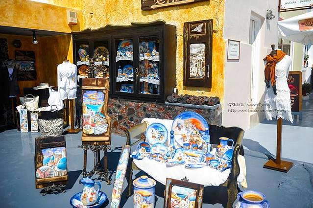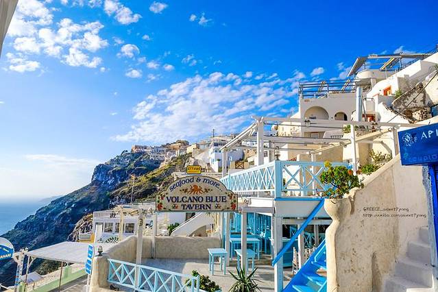 从Fira开始走悬崖步行道,一直走,大概要走8-10分钟左右。直到看到右手边的一家餐厅名叫:Mama Thira,他家布置得很别致,很有趣,应该不会错过。