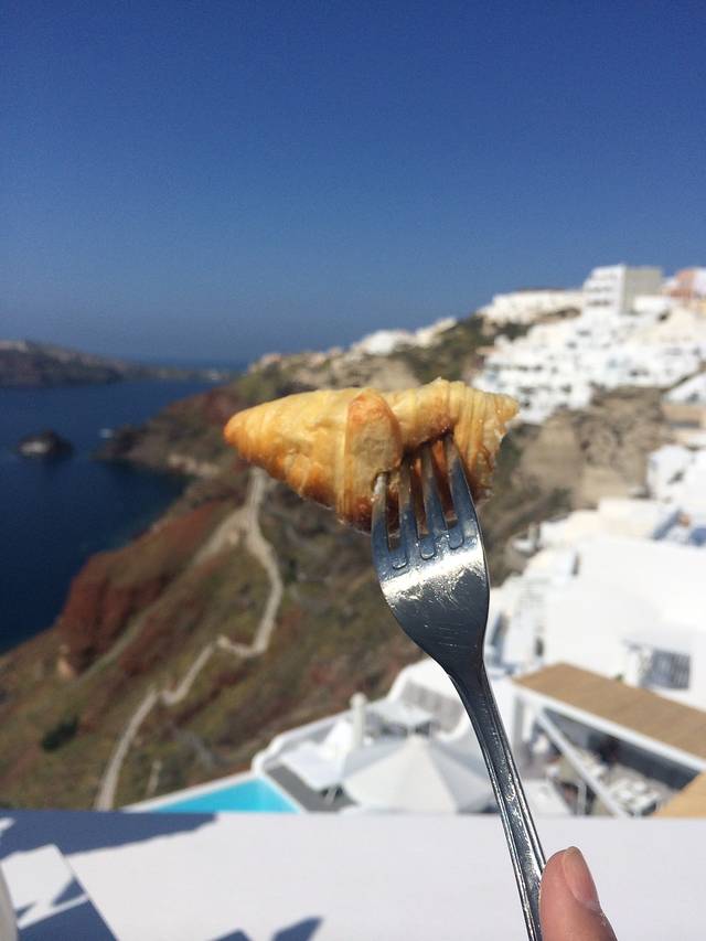 D5: 4月9日,上午在酒店享受美妙时光,或者在OIA闲逛,然后是自留时间。下来回到菲拉,check in。后可以走从菲拉一路向北的经典徒步路线。Fira-Firostefarli-伊莫洛维里Imerrovigli一路山崖边,很美,著名的圣玛利亚蓝顶教堂也在那条路上。耗时45分钟左右。徒步路线的尽头有块大岩石,有时间可以爬上去。