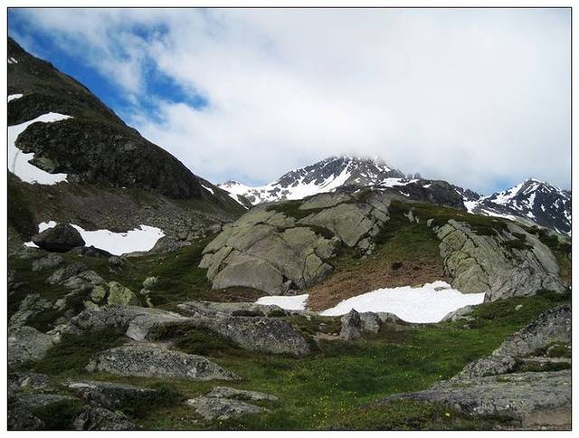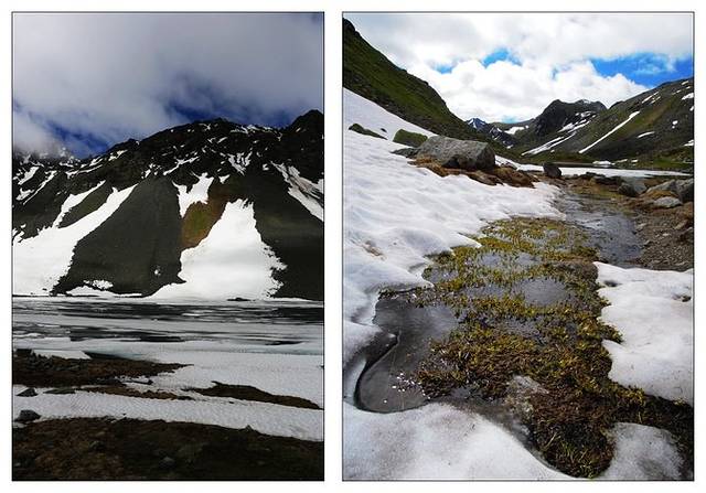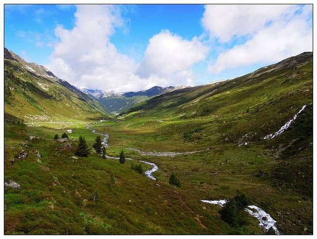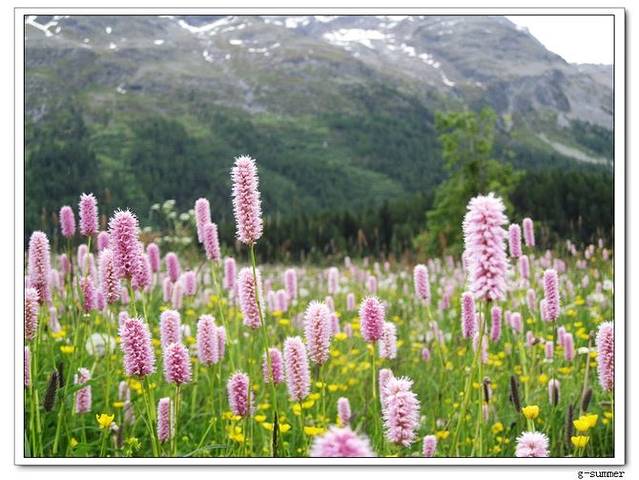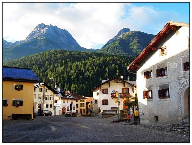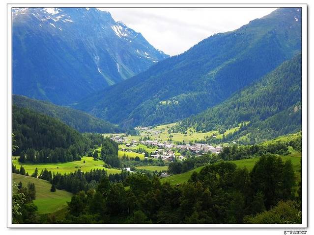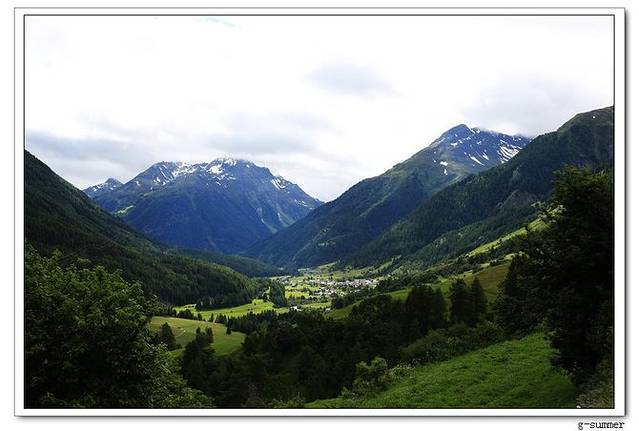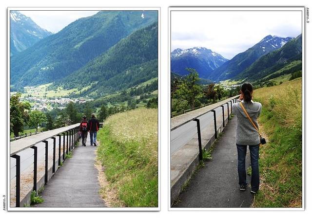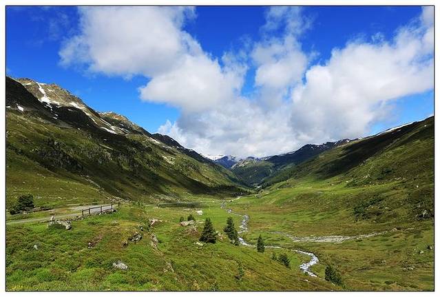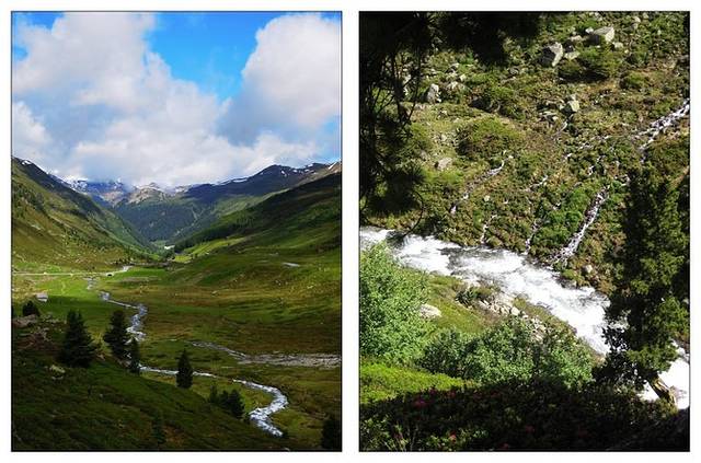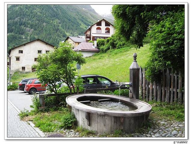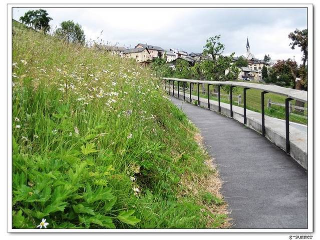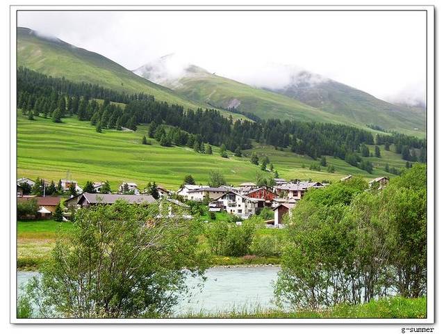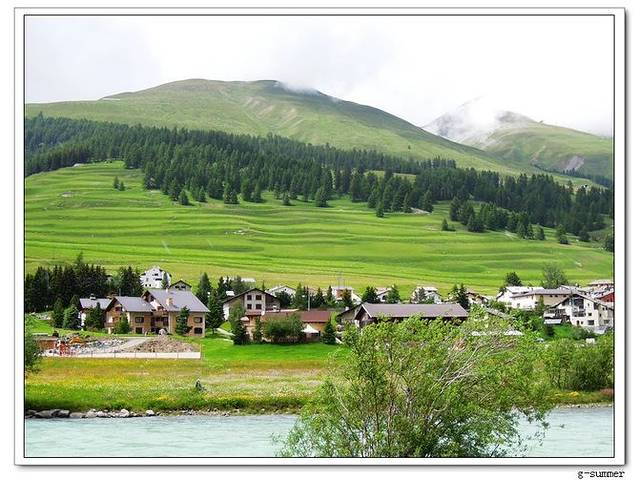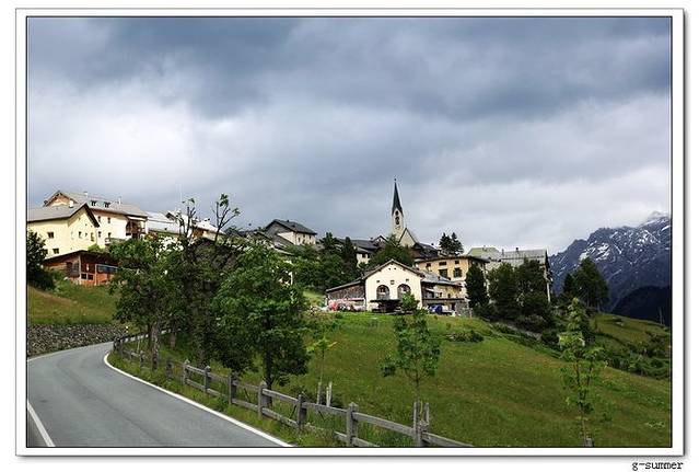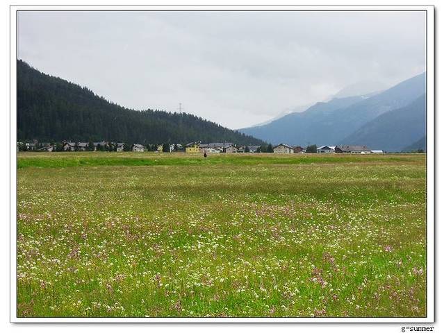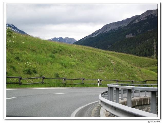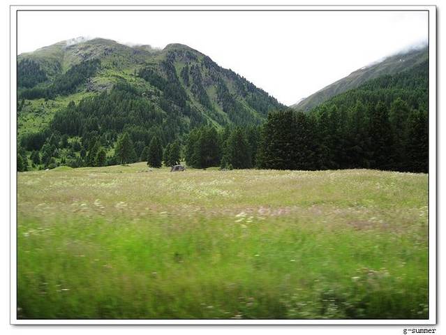 从圣莫里茨往瓜尔达行进,一路上由于国家森林公园的外延在此地,路上的风景异常的美丽,山坡上出现条状的绿带,一层层如绿色的海浪。而冰雪融化的小溪也随处可见,一路的山花浪漫,一路的云雾缭绕,一路的神秘,一路的惊喜。