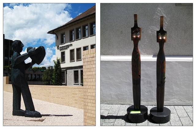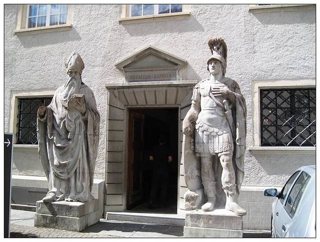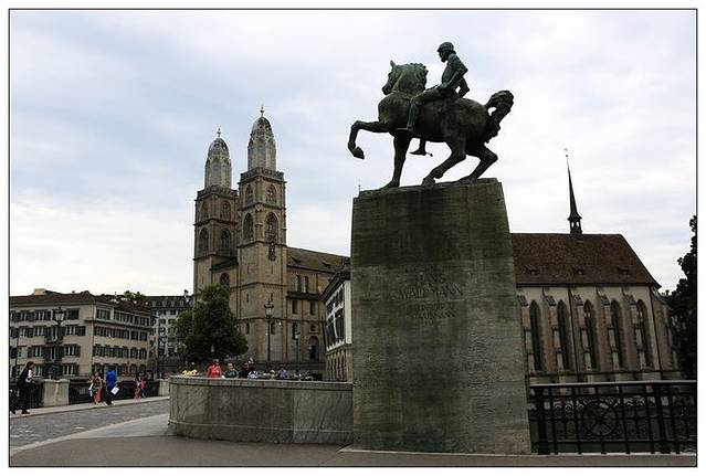 教堂前面建有一座骑马的雕像,骑在马上的威风凛凛的男子是长期就任苏黎世市长的汉斯.瓦特曼(1435-1489)。