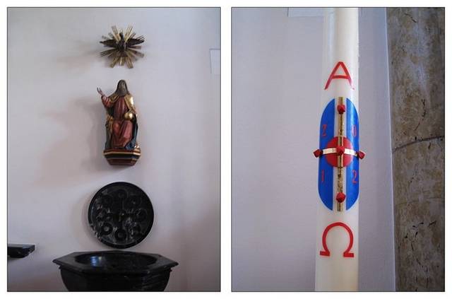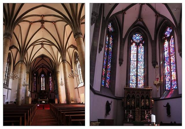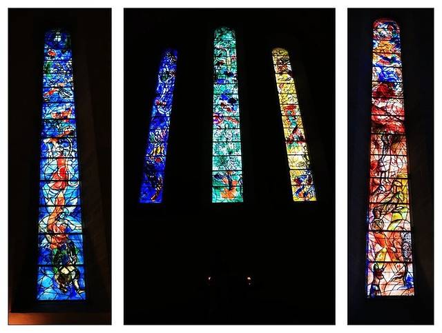 教堂内非常有名的是夏加尔创作的彩色玻璃画(1970年)非常漂亮,在没有礼拜的时候可以自由参观。