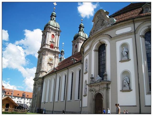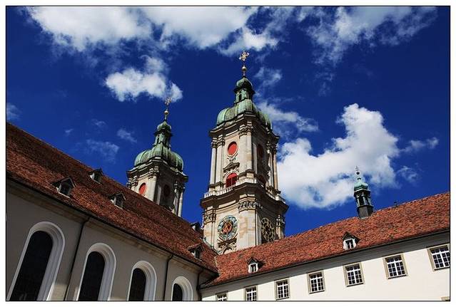 圣加伦大教堂的两座塔楼非常精美,给人印象深刻。这是一座瑞士最具代表性的后巴洛克式教堂。现在看到的建筑是1755-1769年修建的。在装饰豪华方面,正殿祭坛的装饰精美繁复非常少见。