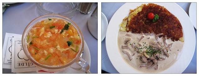 左边这个可不是我们点的,而是自己带的西红柿鸡蛋汤,吃完饭喝口汤会很舒服的。右边是我的黄金土豆饼配小牛肉。