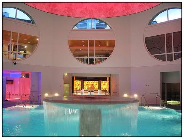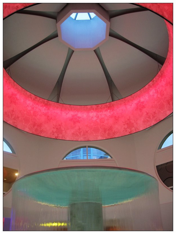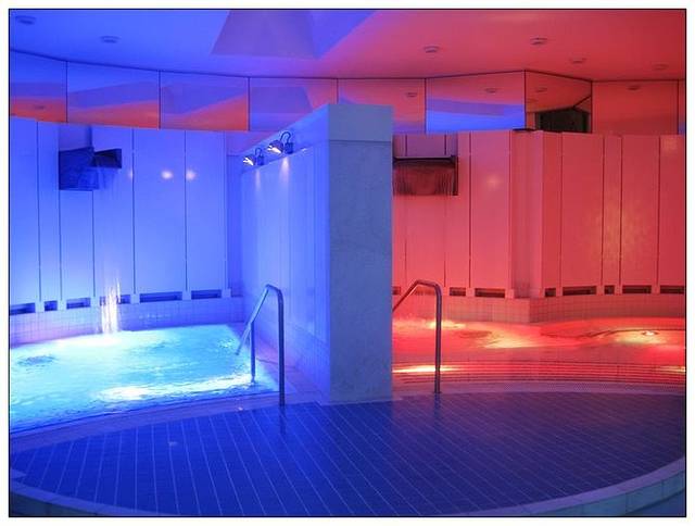 进入大厅,这里完全用灯光和色彩来区分各个功能的池子。中间是主要的室内温泉池,周围配有休息区,桑拿房等。