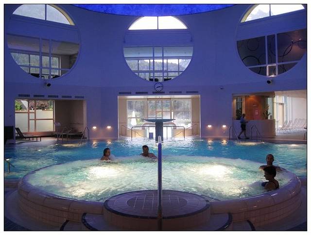疲惫了一天,简单吃过饭,我们便换上拖鞋,拿着浴巾,直奔这里的BOGN ENGIADINA SCUOL温泉中心。这也是施库尔最值得参观的地方,因为施库尔从罗马时代就开始利用喷涌的温泉进行温泉疗养以及高山疗养。