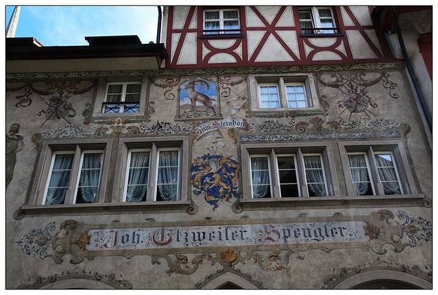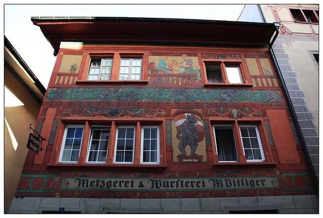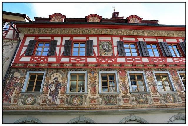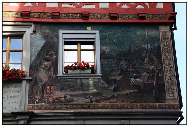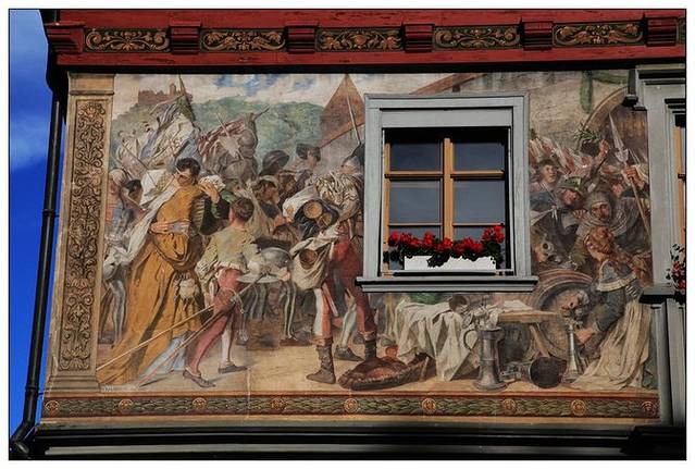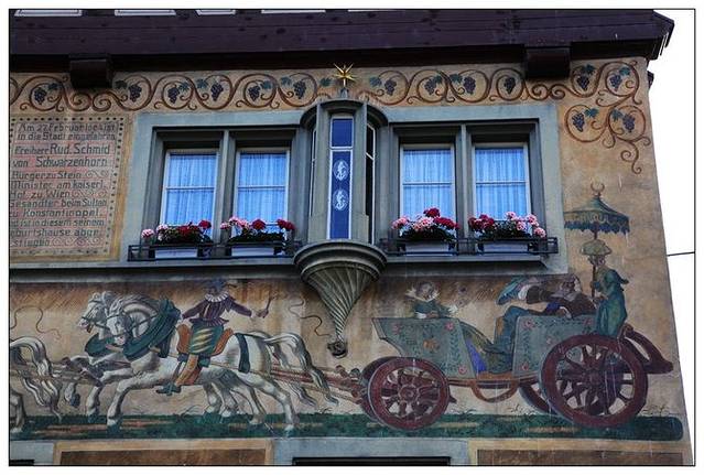 如果说瓜尔达的壁画向我们展示了浪漫的,童话般的世界,像一本翻开的童话画册,那么施泰因的壁画向我们展示的就是非常绚丽的,历史般的世界,像一本翻开的艺术画册。每一幅画都出自名家手笔,甚至每一幅画都有自己的名字,例如“王冠之家”,“鹿之家”,“红牛之家”等等,令人百看不厌。