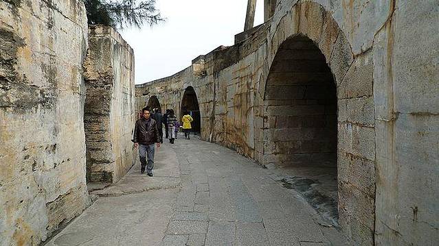 “褒宠”牌坊建于明正德十六年(1521), 这座牌坊为四柱三门楼式,面宽28.5米,牌坊大量采用砖雕,雕刻内容丰富,有鸟兽、花卉、人物等,颇具匠心。坊额石刻“褒宠”两个大字,是明正德皇帝朱厚照手书,额阴刻敕书。