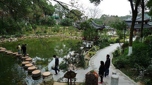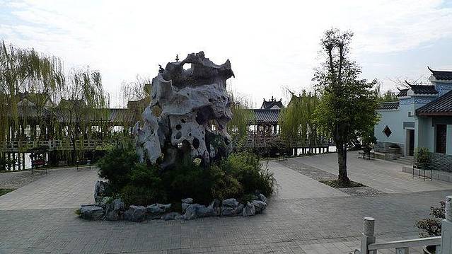 九曲桥在修,那就只好走烟霞桥去丰渚园。放在入园小广场中央的太湖石也是目前岭南地区最大的一块太湖石,顶部有如飞鹅展翅,惠州素有鹅城之称,它就象是热情好客的主人喜迎八方来客。