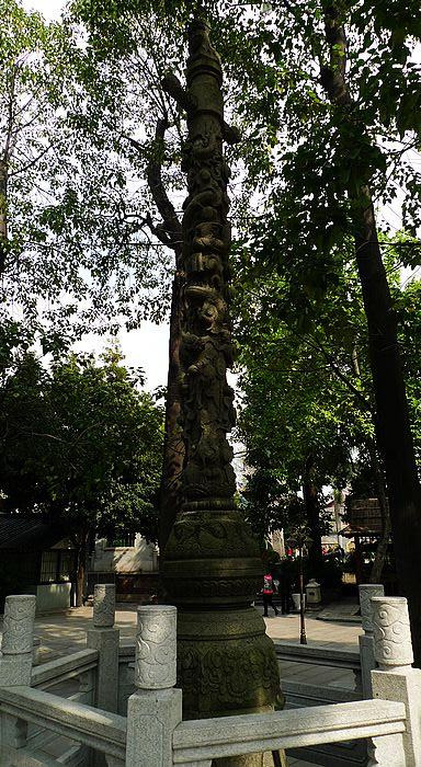 双龙壁两侧,竖立着一对高五米多,用花岗岩石雕成的龙柱。柱顶雄狮盘踞,底部鲤鱼戏水,柱身上双龙戏珠的浮雕鬼斧神工,出神入化,令人叹为观止。佛山人相信双龙能报雨,关于它一直传诵着这样一个故事: