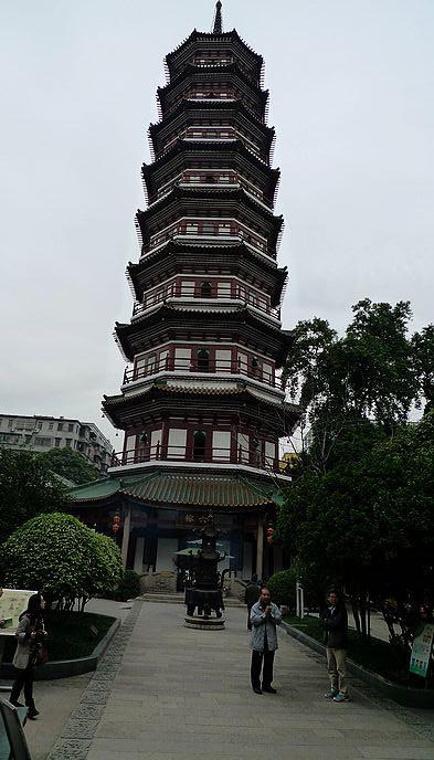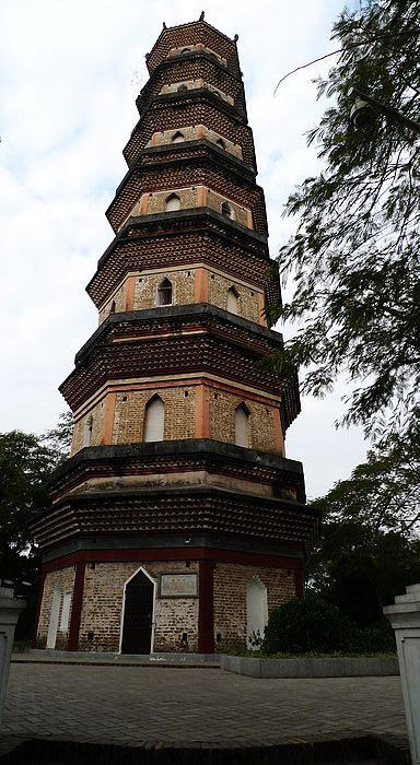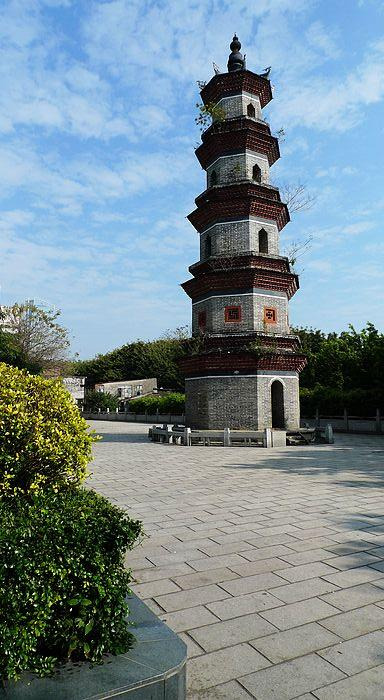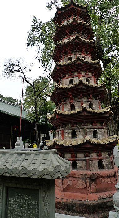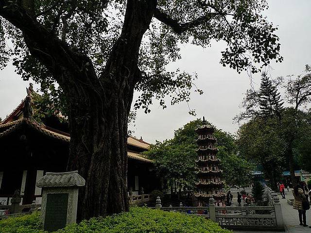 离光孝寺不远,还有一座六榕寺。南北朝时期,梁武帝萧衍派他的舅母沙门昙裕大智法师到真腊(今柬埔寨)求得佛舍利带回广州后,便命令广州刺史萧誉建造了这座寺和塔,当时分别称宝庄严寺和舍利塔。唐上元二年(675年),初唐四杰之一的王勃来到广州,应宝庄严寺主持之邀,挥毫写下了《广州宝庄严寺舍利塔记》。千佛塔,广州人俗称花塔,此塔塔基是用花岗岩石砌筑的九井环基,塔顶有元至正十八年(1358年)铸造的千佛大铜柱。可惜现在花塔不开放游人登塔。