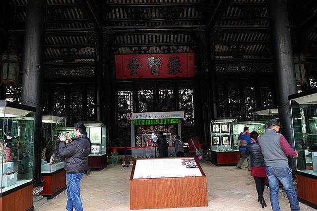中进大厅聚贤堂为书院建筑的中心,是当年族人举行春秋祭祀或议事聚会的地方。堂宇轩昂,庭院宽敞。梁架雕镂精细,堂中横列的巨大屏风,玲珑剔透,为木刻精品。屋顶上的陶塑瓦脊长27米,全高4.2米,是清代广东石湾陶塑商号文如璧的作品。堂前有白石露台,石雕栏杆嵌以铁铸的花卉等图幅。堂宽五间,27米,进深五间,16.70米。用柁墩抬梁,设斗拱,21架6住出前后廊,属通堂木框架。后金柱正中三间装有12扇双面镂雕屏门挡中,两侧装设花罩。堂前有月台,石雕栏杆及望柱均以岭南佳果为装饰,镶嵌铁铸通花栏板,色调对比鲜明,装饰华美,突出了聚贤堂的中心地位。