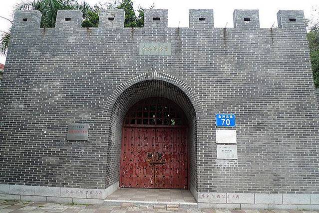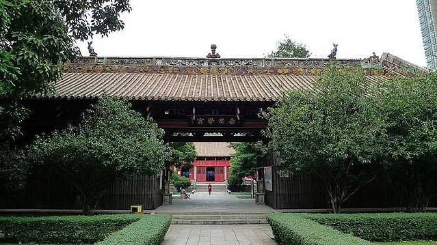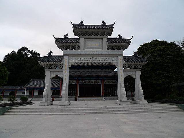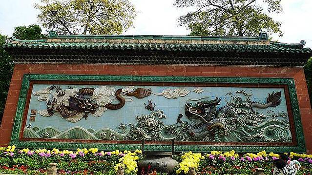 现在买门票的地方在清代重修的新正门,走进去就能看见麒麟-瑞兽琉璃双龙照壁,由于正门直冲大路,因此必须修建照壁遮挡视线,以免里面被一览无余,这是中国传统建筑格局的讲究。原建于1958年,后被毁,于1981年初重修。“双龙争珠”栩栩如生,是石湾陶塑艺人的精心杰作。
