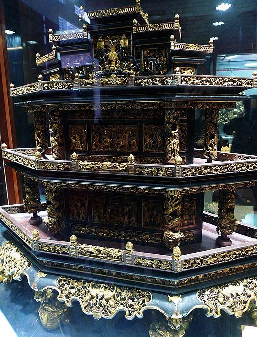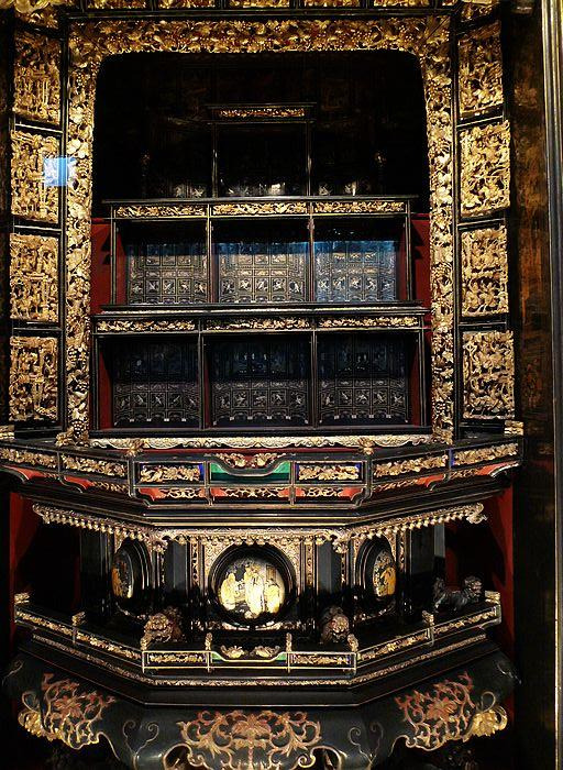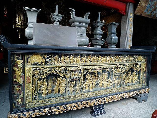 神龛内分三层共九个小格,用于摆放神主牌位,每格内黑地描金绘山水、花鸟。两扇大门内侧上半部是精致的多层镂雕,饰历史故事,外侧上半部用简练明快的刀法雕刻人物,下半部的内外侧均为黑地描金绘历史故事。