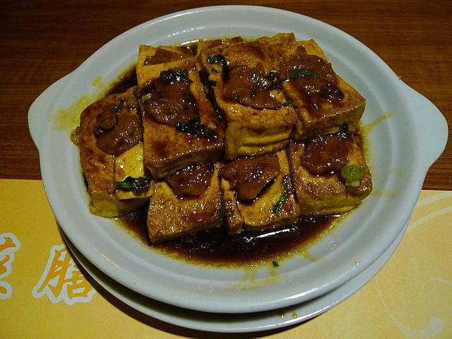 在惠州任何一家客家菜饭店,东江酿豆腐都是必备的招牌菜,也是客家人喜庆日子里的必备佳肴。“酿”是一个客家话动词,表示 “植入馅料”的意思,“酿豆腐”即“有肉馅的豆腐”之意。据说这道菜源于北方饺子,因南方少麦,客家人便用酿豆腐寄托对北方饺子、中原文化的感情。每逢时节喜庆,或者闲忙之余,它是农村客家人的最爱。