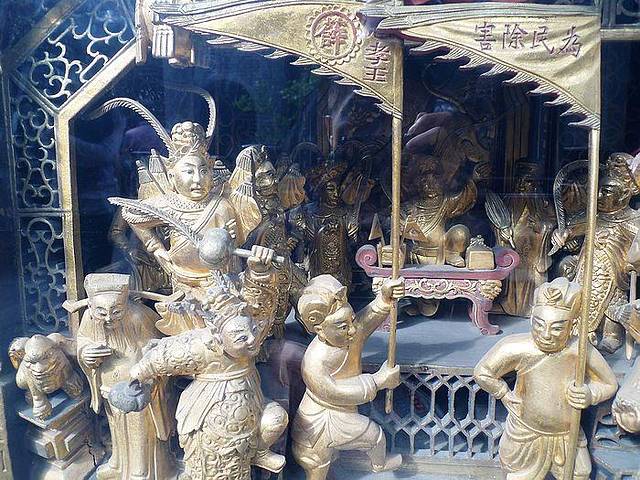 这是潮州金漆木雕神龛,打开两扇大门,通体是金碧辉煌、精雕细刻的纹饰,有龙、凤、鸡、羊、花鸟、瑞草等,图案茂密繁复而又不显杂乱。