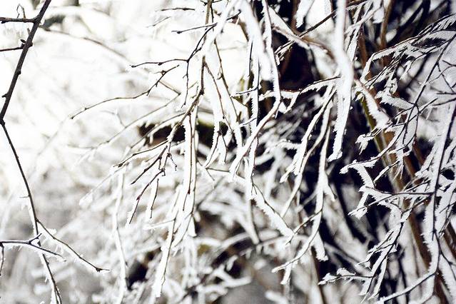 路边的灌木枝一个个的都结上了冰渣,看起来就像是挂上彩灯的树枝,如果有霓虹灯照射上去肯定会有五彩世界的感觉。