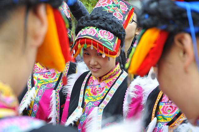到达景区落脚点的时候,我被这些穿着鲜艳羌秀的羌族服装的美女们深深的吸引了。