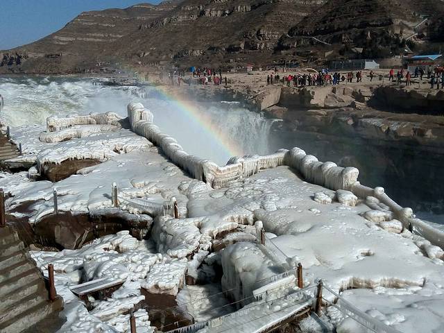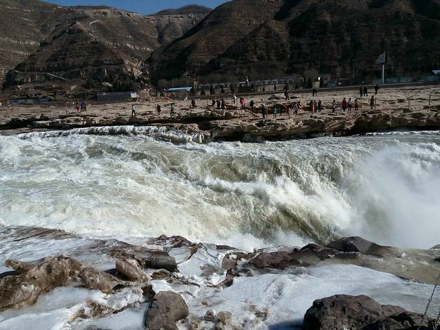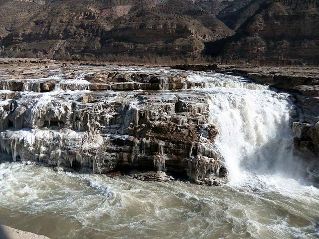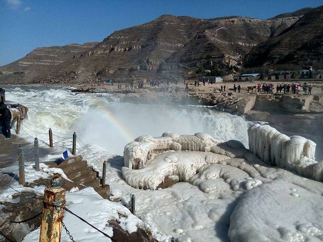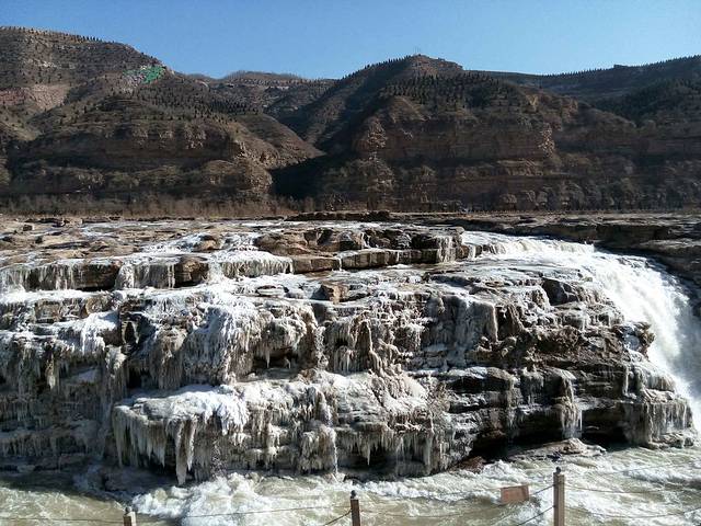大早上起早为了坐最早的七点二十班车去壶口瀑布,结果因为冬天班车早上只有八点二十的就等了一个小时,然后坐了三四个小时的班车一路经过黄土坡各种颠簸终于到了壶口瀑布,不过事实证明一切艰辛都是值得的\^O^/冬季壶口既有冰柱也有奔腾壮阔的景象实在太美