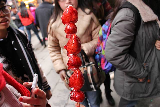 冰糖草莓上还有山楂,山楂好苦。草莓还可以。包裹草莓的糖好硬。