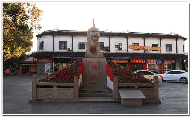 镇广场中央矗立着一座独角怪兽“甪端”的雕塑。