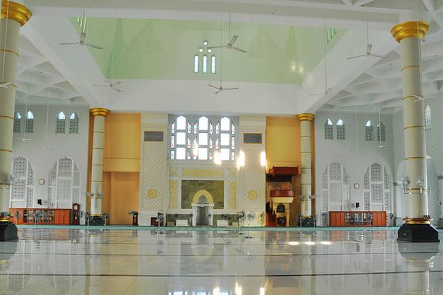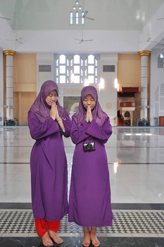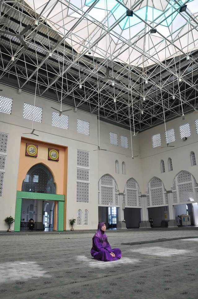 外面转了一圈,又花6马币租了两身衣服入内参观~其实租衣服的初衷是为了配合建筑来凹造型的,可是,想好看就要有代价,三十几度的天,裹着袍子和头巾,热疯了我。。。清真寺内部装修相当简单,不像欧洲的教堂那样有壁画有浮雕有炫目的彩色玻璃,属于清淡style~