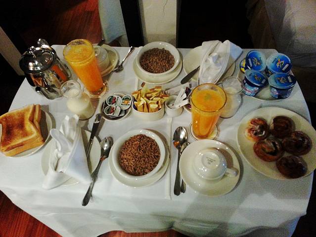 前一天晚上睡得太晚,不得不放弃了一早起床去丽丰冰茶室吃早餐的计划(始于1956年的老店,牛腩面十分出名,就在茨厂街入口斜对面,有兴趣有时间的盆友可以去试试)。因为晚上那餐宵夜很美味,于是就直接把早餐也定了Room Service。早餐单就在房间内,选好你要的品种和吃早餐的时间,前一天晚上挂在门口即可。我们选了两份欧陆早餐,39马币一份,八点半准时送来房间,非常丰盛~~土司和丹麦面包还很贴心的用餐巾包裹以保持烘烤的温度。
