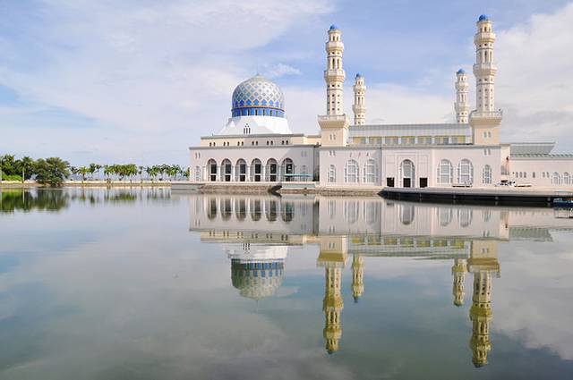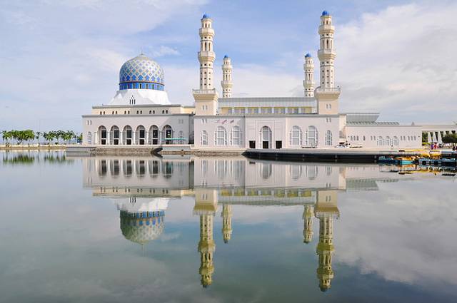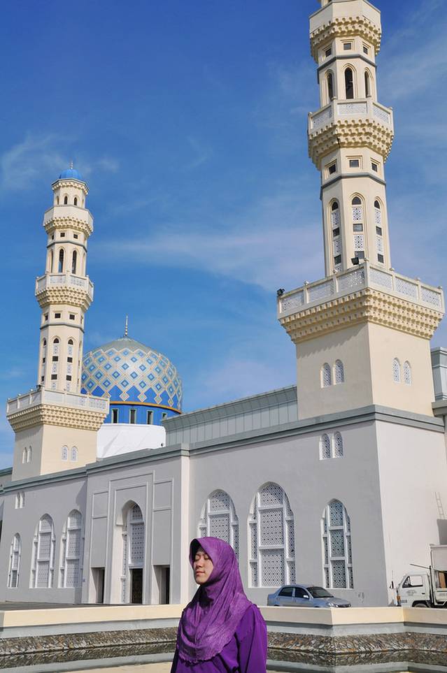 吃完饭原本想坐公交车去水上清真寺,问了一圈,无果~~于是,改打车(20马币),一路上沿海公路风光相当好~大概15分钟就到了,大门口可以拍到全景,当天没有风,艳阳高照,倒影无敌,惊艳!
