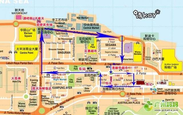 补一张做功课时搜到的亚庇地图,应该也被转载过很多次了吧~~很清晰的一张图,地标和餐厅都标注的很清楚~~~我自己把63酒店也标了出来,方便大家定位~~向原作者致敬,如果有缘你能看到的话,代表广大因此受益的穷游er衷心的说一句,谢谢!