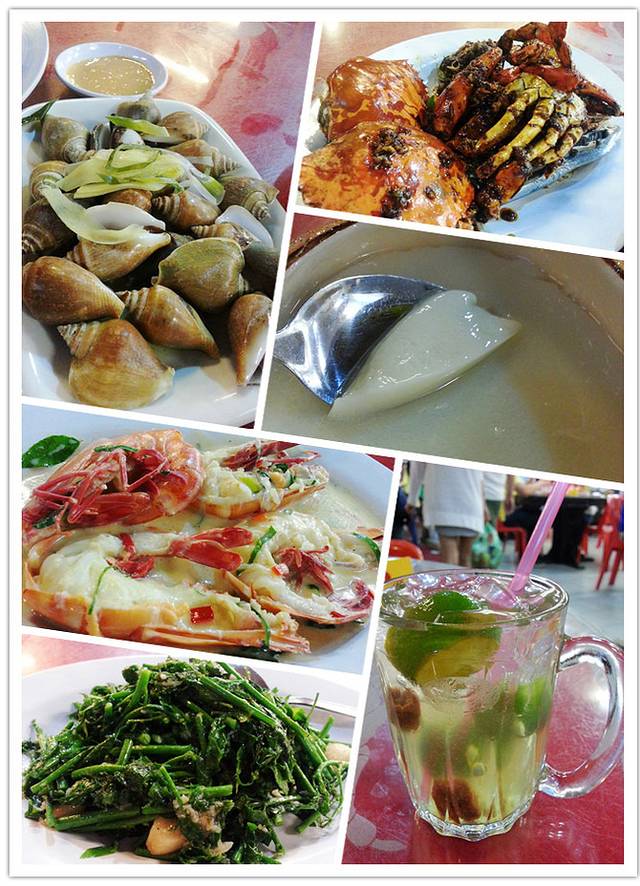 视觉大餐之后,吃货们又该祭祭五脏庙了~~打车到大茄来(依然30马币),海鲜晚餐~~到了大茄来,我就惊呆了。。。我以为是一家餐厅,可是,它是一条街啊,太霸气的场面了,整整占了一条街的店面~~等了大概15分钟就有位子了,我们点了辣炒螃蟹、奶油老虎虾、白灼东风螺、树仔菜、椰子冻、橘子冰,虾和蟹都有分大中小,店员会按照你的用餐人数来选择,帮我们选的都是中号的,基本就是给你配一人一只蟹一只虾~螃蟹和老虎虾的肉都超级紧实超新鲜,东风螺原汁原味配上腐乳酱,完美啊,椰子冻QQ的也很好吃,橘子冰就不如怡丰和冯业了,两个人吃了134马币,很满足~~(照片依然是手机拍的,三星出片的水准值得按赞)