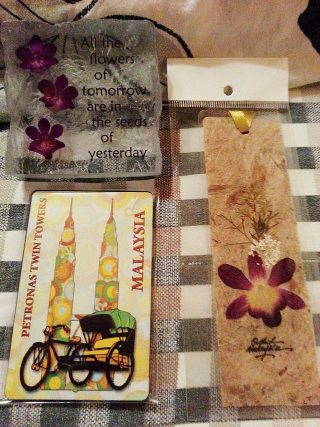 午餐后打车到双子塔,拍照留念~~可惜当天阴天,效果不那么好~~安慰自己,留点遗憾才会成为下次再来的理由和期待~~花了大概两小时不到逛了逛双子塔,有高大上的奢侈品,也有很平民的普通商品;在负一楼。有一些小摊,售卖小纪念品,在那里,买到了我在马来西亚见过的最美的明信片、冰箱贴,还买了兰花做的书签、纸镇,算是吉隆坡半日游的一大惊喜~~要寄明信片的朋友,可以在负一楼KFC旁边的邮局寄,但是排队的人很多~我们是请酒店代寄的,一样是收0.5马币的邮费~~