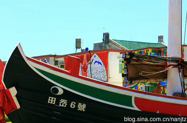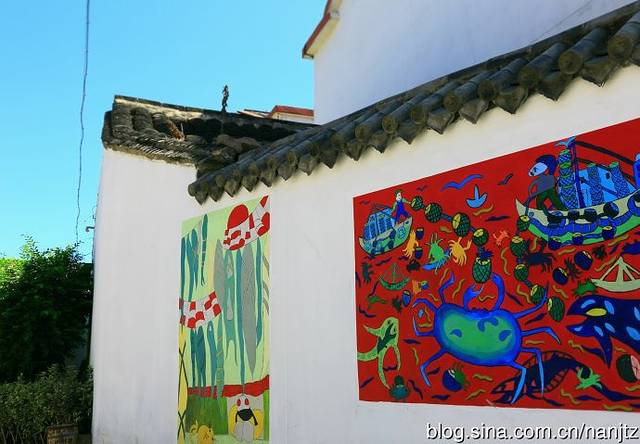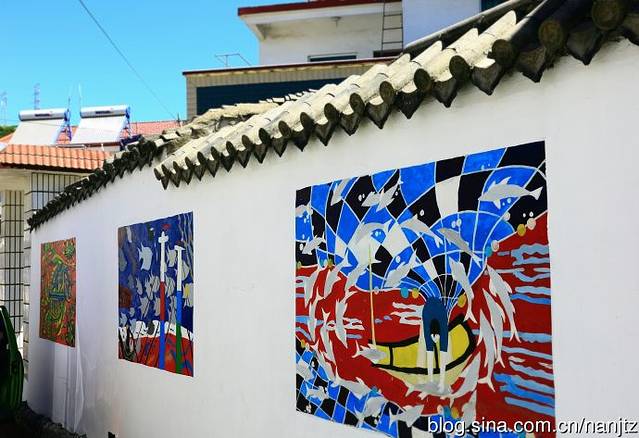 鱼儿游在屋顶、挂在树上、悬在空中,章鱼的触须爬满了院墙,螃蟹在小楼间横行霸道,渔船在门窗间来回穿梭、、、这些落笔浓重,用色大胆,想象丰富的渔民画,都搬到了田岙村的院墙上。