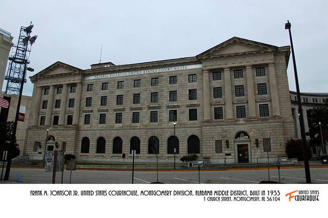 Montgomery的主街可以简化成两条成直角连接的大道,一条Dexter大道向东,沿线预审法院、最高法院、州议会大厦和州务卿办公室。州律师协会大楼门前树立着代表性的州最高法院大法官雕像,背后的墙面刻着联邦最高法院大法官、纽伦堡大审判美国总检察长Robert Jackson的名言“我们不是因为毫无差错而成为最终裁决者,我们紧紧是因为最终裁决者而必须毫无差错”。另一条Commerce大道向北,直达Alabma河大拐弯处。Alabama河畔有块牌子,记载着1961年大洪水的水位线,河面抬高了3米。
