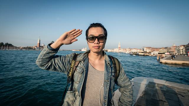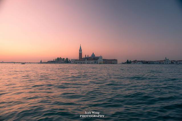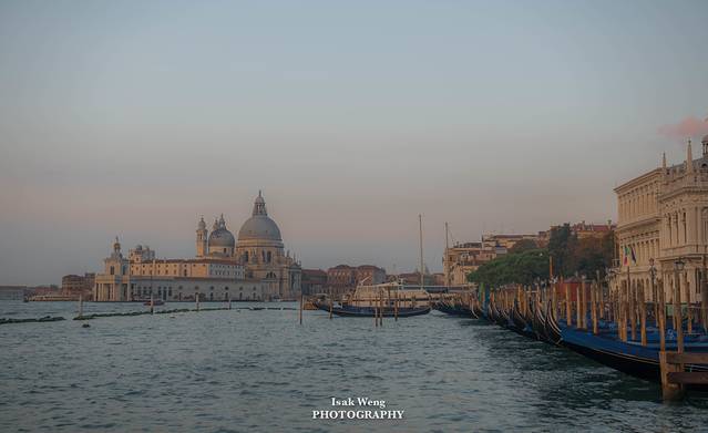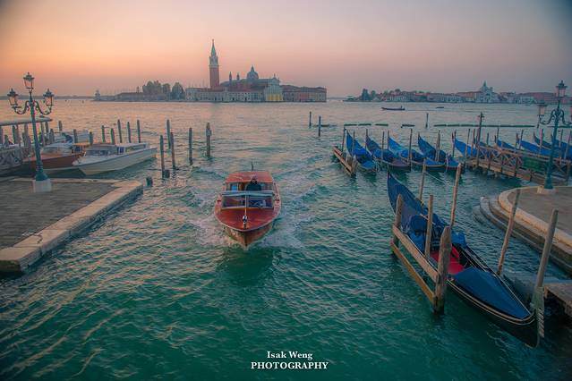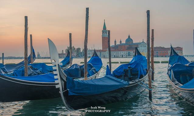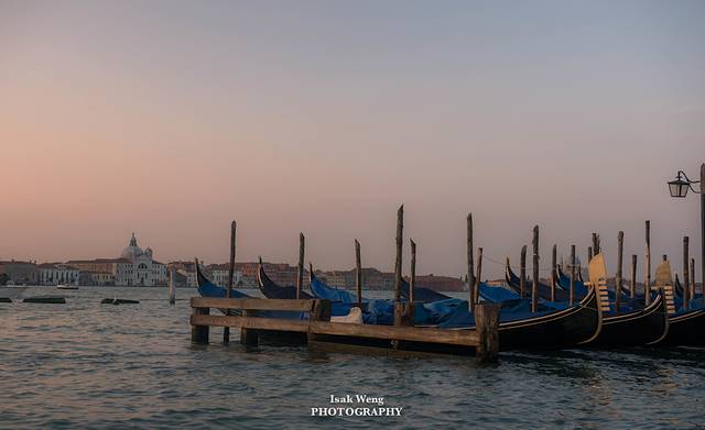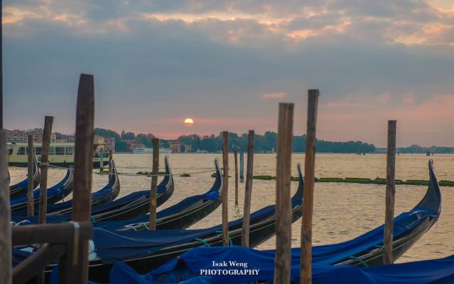 威尼斯朝阳出升时,并未卷起一天火云,它的四周是一片浅玫瑰色的晨曦。太阳,并不厉害,不象在令人窒息干旱的日子里那么炙热,也不是在暴风雨之前的那种暗紫色,却带着一种明亮而柔和的光芒,从一片狭长的云层后面隐隐地浮起来,露了露脸,然后就又躲进它周围的云层里。而我们这端大家都端着手中的长枪大炮,捕捉这一天里最美丽的时刻。