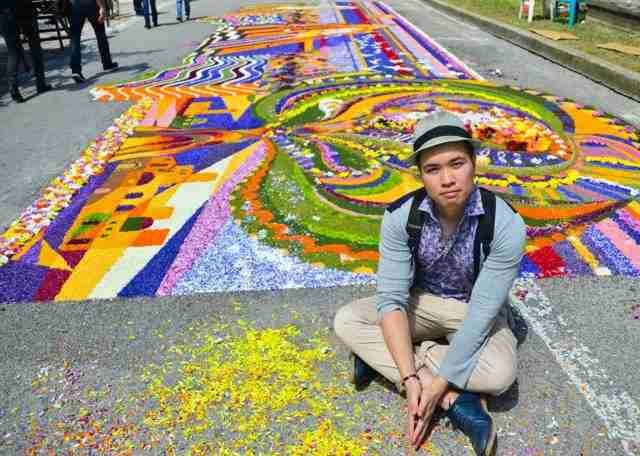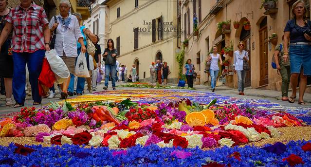 斯佩罗spello的鲜花节,意大利语是infiorata,其实翁布里亚小镇spello的圣体瞻礼仪式,教职人员和礼乐队组成队巡游队伍环城一圈向圣人圣体致敬。节日发生在6月科铂斯克里斯蒂是个宗教节日。这一天,spello的所有主要街道和广场上,都铺满了干花屑组成的花毯,美轮美奂。而这些花毯全是为仪式巡游踏足而用。游者踏过,图画便凌乱,仪式久完成,全城游客就散去,留一个亢奋过后的轻飘飘的黄昏。花碎构成的天使,基督而容在风中浮动。spello本是非常朴素的中世纪小城,和翁布里亚其他城市差不多,石头是绝对的主。