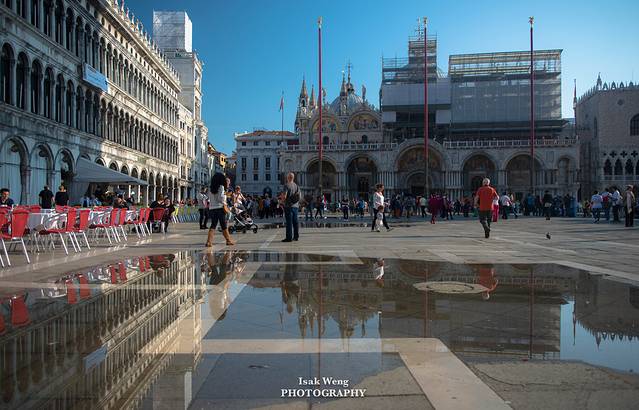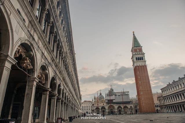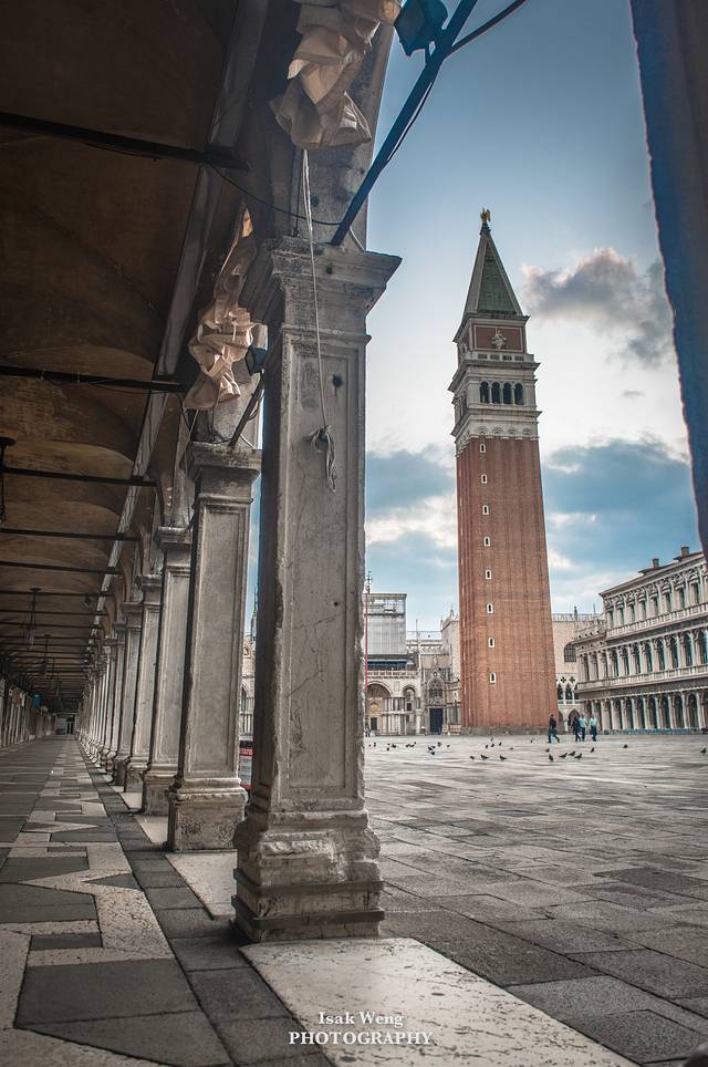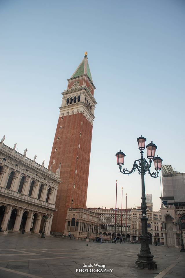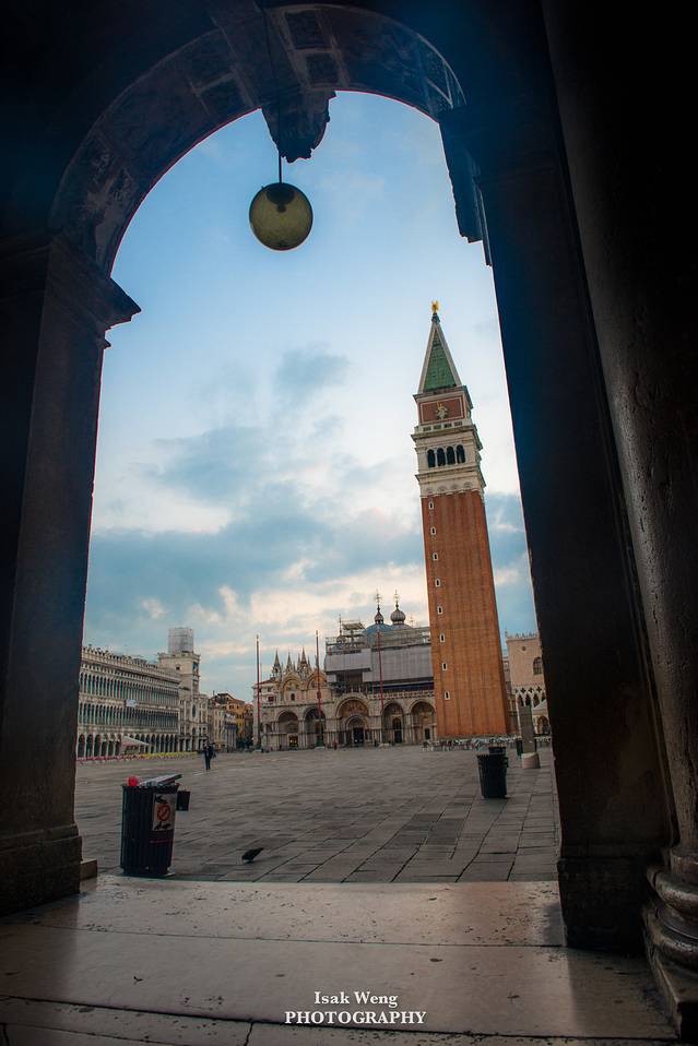 穿过商业街,就是圣马可广场了,透过石门就能看到钟楼。圣马可广场是拿破仑眼中的欧洲最美客厅,全年都是人满为患,只有清晨才能静静享受他的美妙。