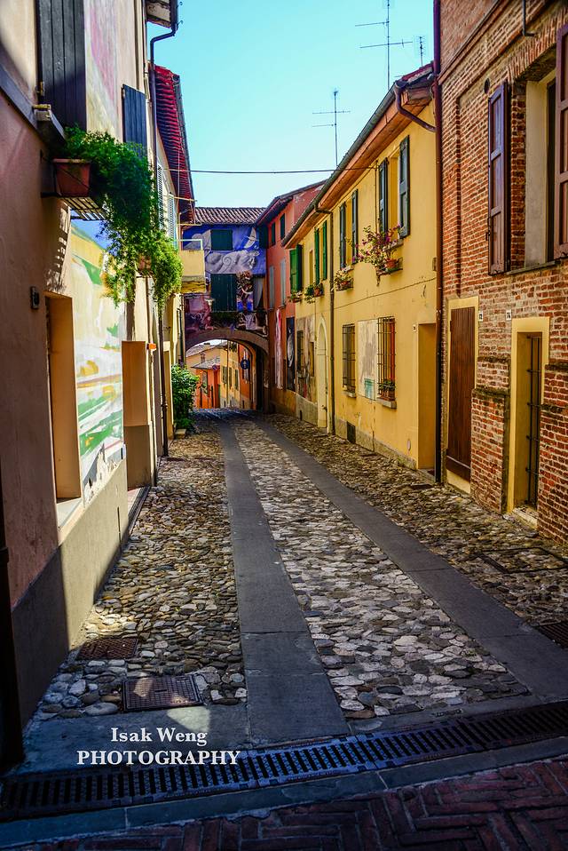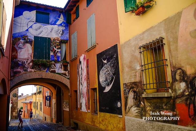 我是在2013年八月假期去的那里,那时候我们住在ravenna,去那个milabilandia游乐场玩。结束了一天的游乐场,我们安排了一天时间给了这座壁画村。小村及其安静,除了我们就没有别人,就连村民也是微乎其微。小镇安详和平,又美丽妖娆和妩媚,微风轻拂面,一切是那样的舒适和迷人。处处皆是名画,款款总是情。一座充满了无限故事的小村庄