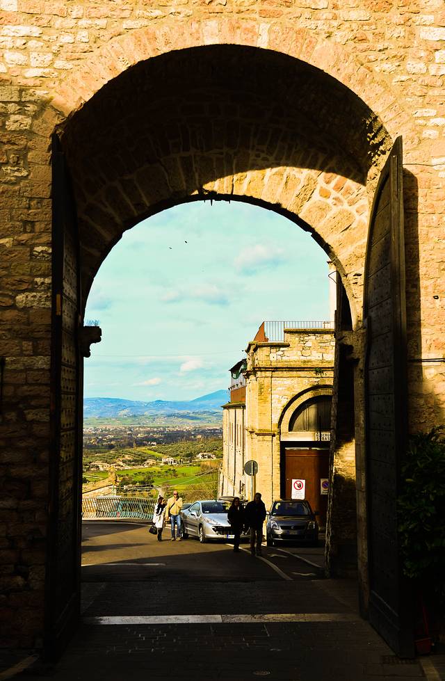 啊西西assisi的历史比较独特,是一个因为宗教而兴起的小镇。小镇伤随处都渗透着浓郁的宗教氛围。在城市的入口就能看见一段欢迎语:citta della pace 和平之城
