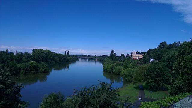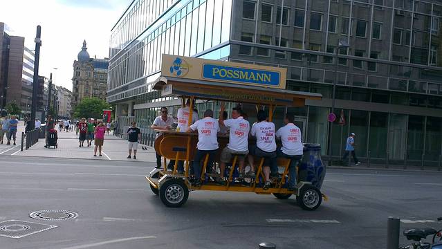 终于又回到了大城市,没啥感觉,还是喜欢小城市。莱茵河畔的法兰克福,阳光灿烂的时候还是挺美的,河边的草坪有不少人在晒日光浴,游乐场里大人小孩都非常欢乐,还看到一种可以容纳十个人左右边坐边骑边喝啤酒的娱乐项目,真是够嗨!
