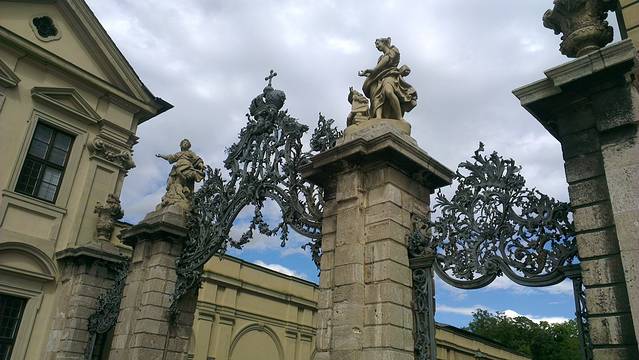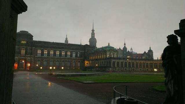 巨大的庭院里有喷泉有草坪还有各类雕塑。从十字架教堂下来再走到这里已经有点晚了,所以博物馆的部分都关门了,只有从外面的玻璃窗朝里面眺望眺望。在庭院里晃晃然后开始下暴雨,躲在一个穹顶下面躲躲雨,看着对面也是宫廷一样的房子慢慢亮起暖黄色的灯光,只能幻想有没有什么王子来解救一下灰姑娘,还有灰姑娘的爸妈啊!