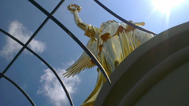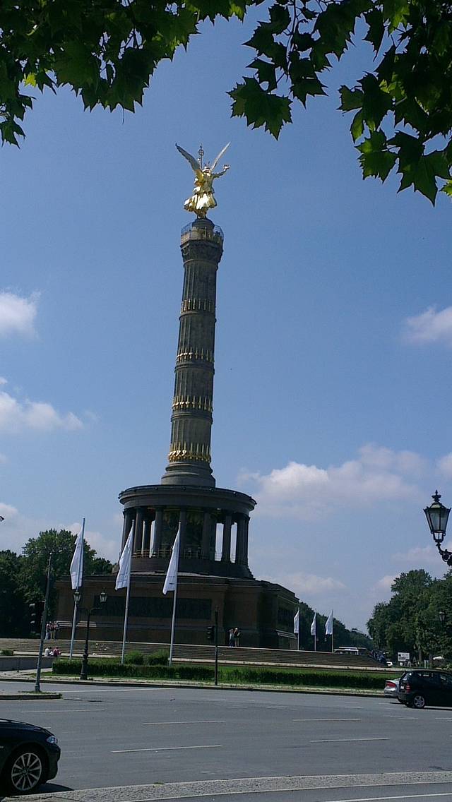 胜利柱是一个纪念碑,离勃兰登堡门不远,就在穿越勃兰登堡门向西的大街中央,四周是树林和放射式大街,可以进去参观,底楼是一些历史背景介绍,然后可以爬上一个螺旋式的台阶,到大概五十米高左右的顶端参观,不但可以看到金色的胜利女神,而且可以鸟瞰一下柏林的360度全景,很漂亮。