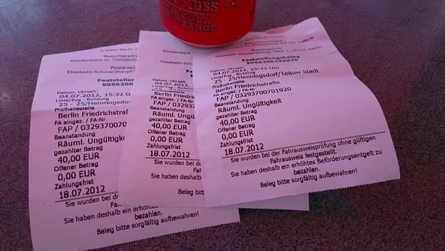 在柏林的几天都没有开车,室内的话坐火车坐地铁也是很方便,可是没想到竟然大出血。忘了是从哪里去哪里了,买票之前还咨询了一个当地人,她说可以买那种三个小时之内随便坐的票。买票的时候用他们那个机器,是可以选英文,但是那么长的说明谁仔细看啊,我就选了一个短程票short journey,票价大概是1欧还是2欧,结果碰到查票的,说我们买的票不对,这个票是只能坐三站的,我们坐了大概有五站吧,然后给了我们一人40欧的罚款,三个人就是120欧啊,肉痛啊!所以搞不清楚的话还是去人工窗口买票吧,或者还是要好好仔细看说明。后来我在其他旅途中碰到柏林来的老太太,跟她讲了这个故事以后,她简直拍案而起,她说怎么能对游客如此不近人情呢,还说如果她在那里一定是要为我求情的,哈哈!算了,俺们天朝来的就是来支援你们的国家建设的。