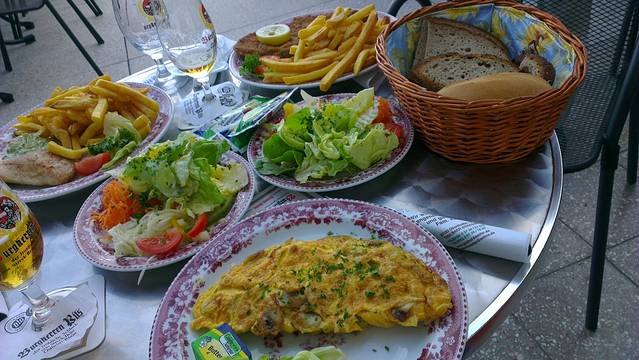 德国吃的跟荷兰差不多,简单家庭的一日三餐就是用面包夹各种东西,芝士啊火腿啊培根啊,或者果酱啊巧克力片啊香蕉啊,总之什么都能夹。饭店的东西虽然不便宜但是量都超大,一个人基本上吃不完。