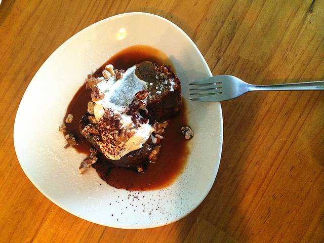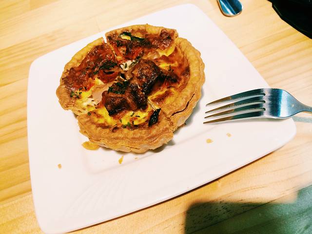 西红柿鸡肉咸派:派皮是葡式蛋挞的千层酥皮,非常酥松,层层分明,其实就像是一个放大版蛋挞,滑嫩的蛋包裹着鸡肉,顶上的西红柿被烤的软而不烂,一口下去,咸派居然能给人甜点的满足感。