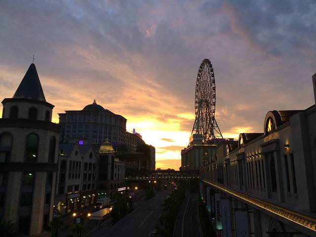 站在天桥上,左边是国际宿舍,右边的outlets,晚霞弥漫半个天空,仿佛置身于画。