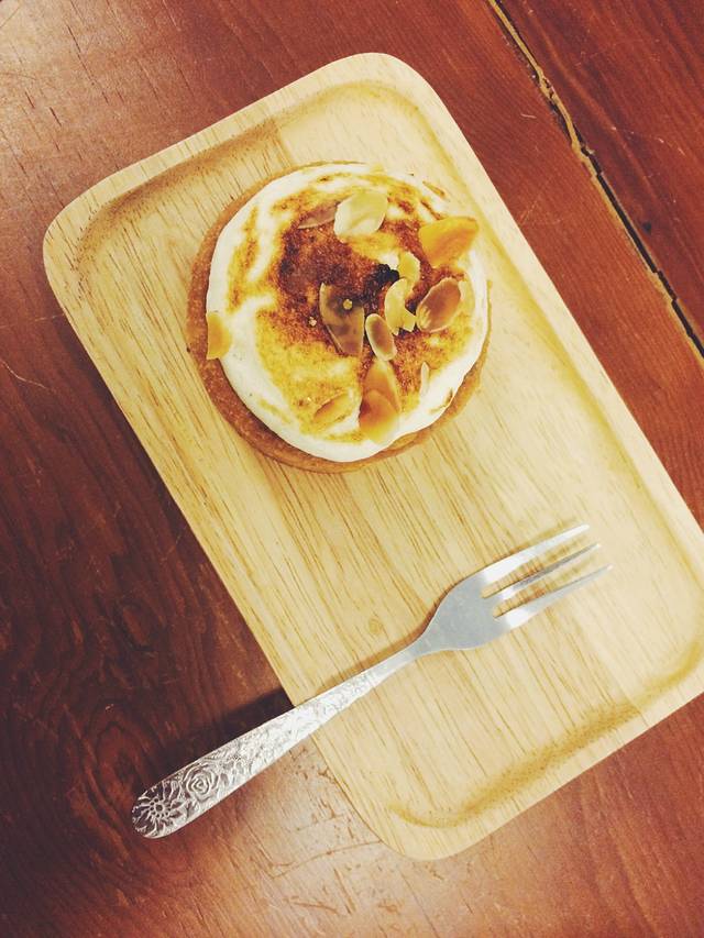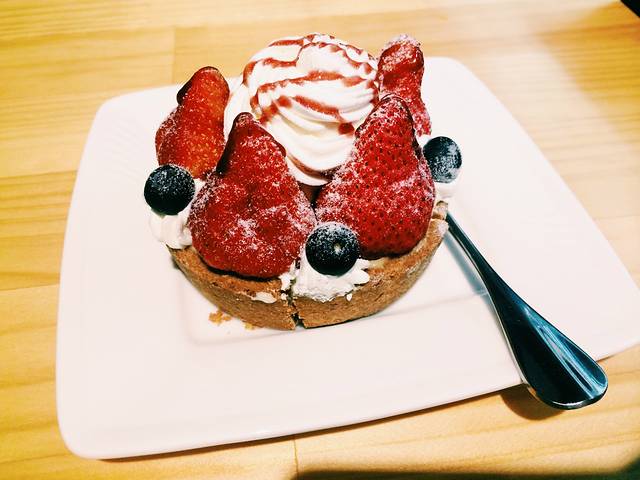 新鲜草莓塔:塔皮脆硬,比黄油饼干更扎实。内里卡仕达酱浓稠,和草莓的甜酸以及塔顶的鲜奶油相配,口感层次丰富。